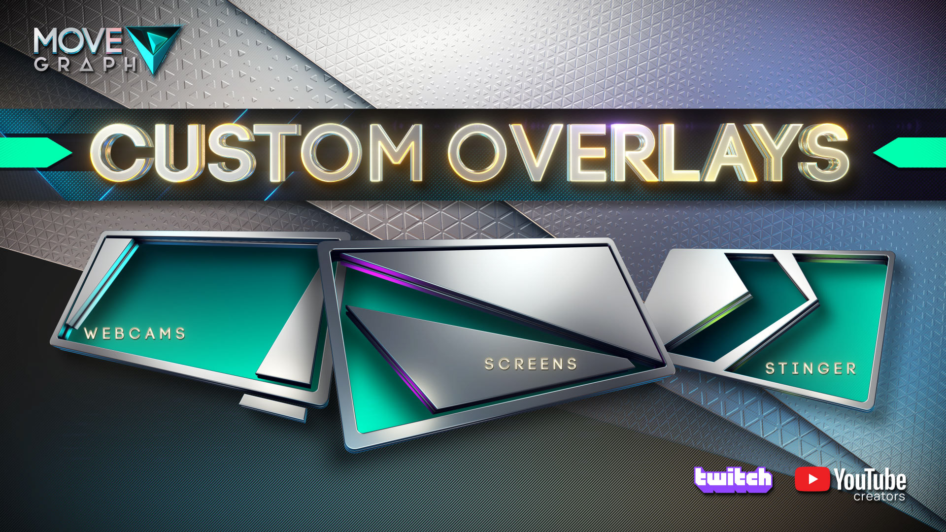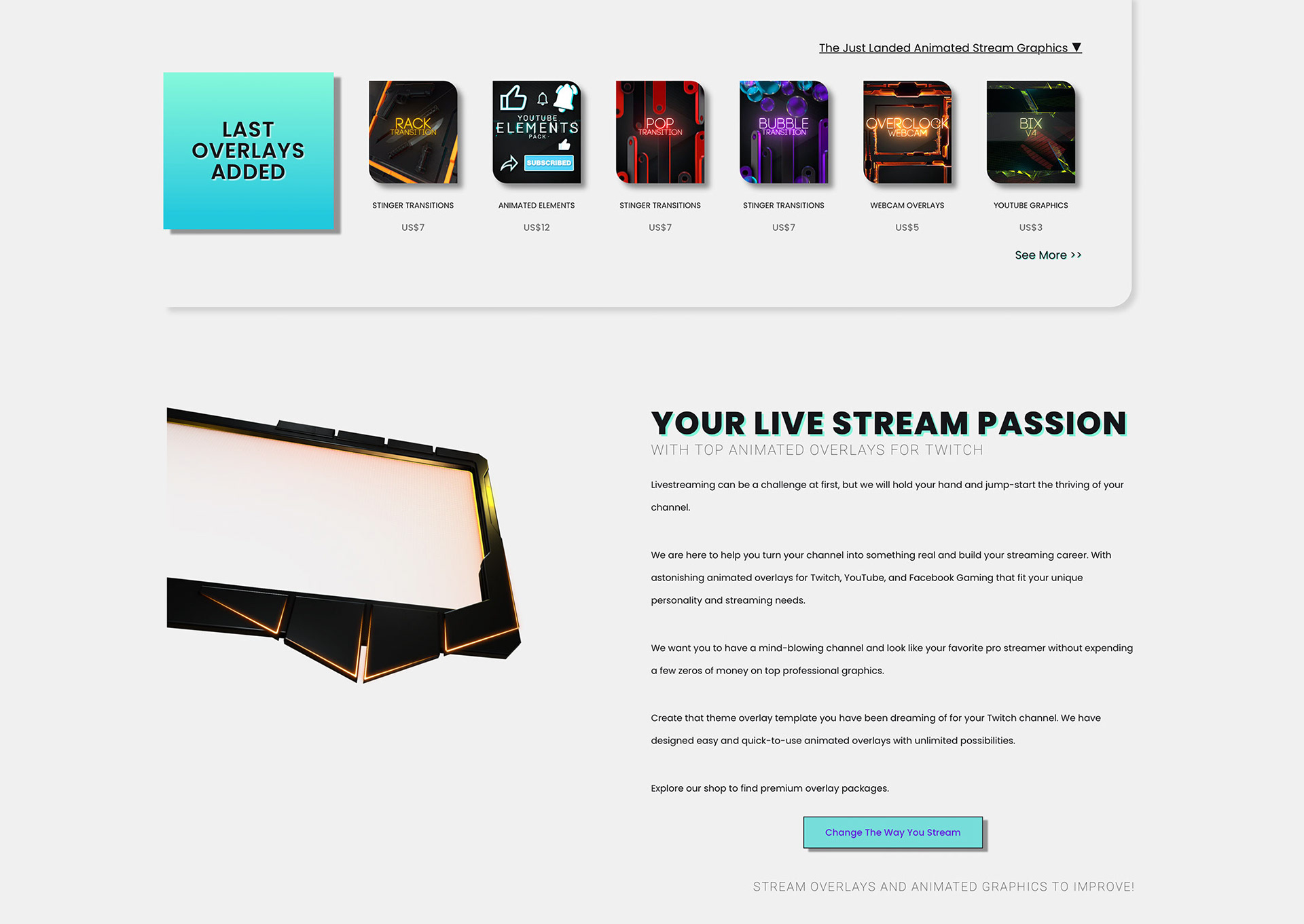 We did: Four years of product design and animation for MoveGraph, a premium streaming graphics brand. We designed, animated, and launched a full catalog of products for Twitch, YouTube, and Facebook Gaming creators: animated overlays, stinger transitions, webcam frames, stream screens, alert bars, subscriber elements, and game-themed packs. The product line included both ready-made packs and custom overlay services, with tiered pricing tiers and a full e-commerce storefront.