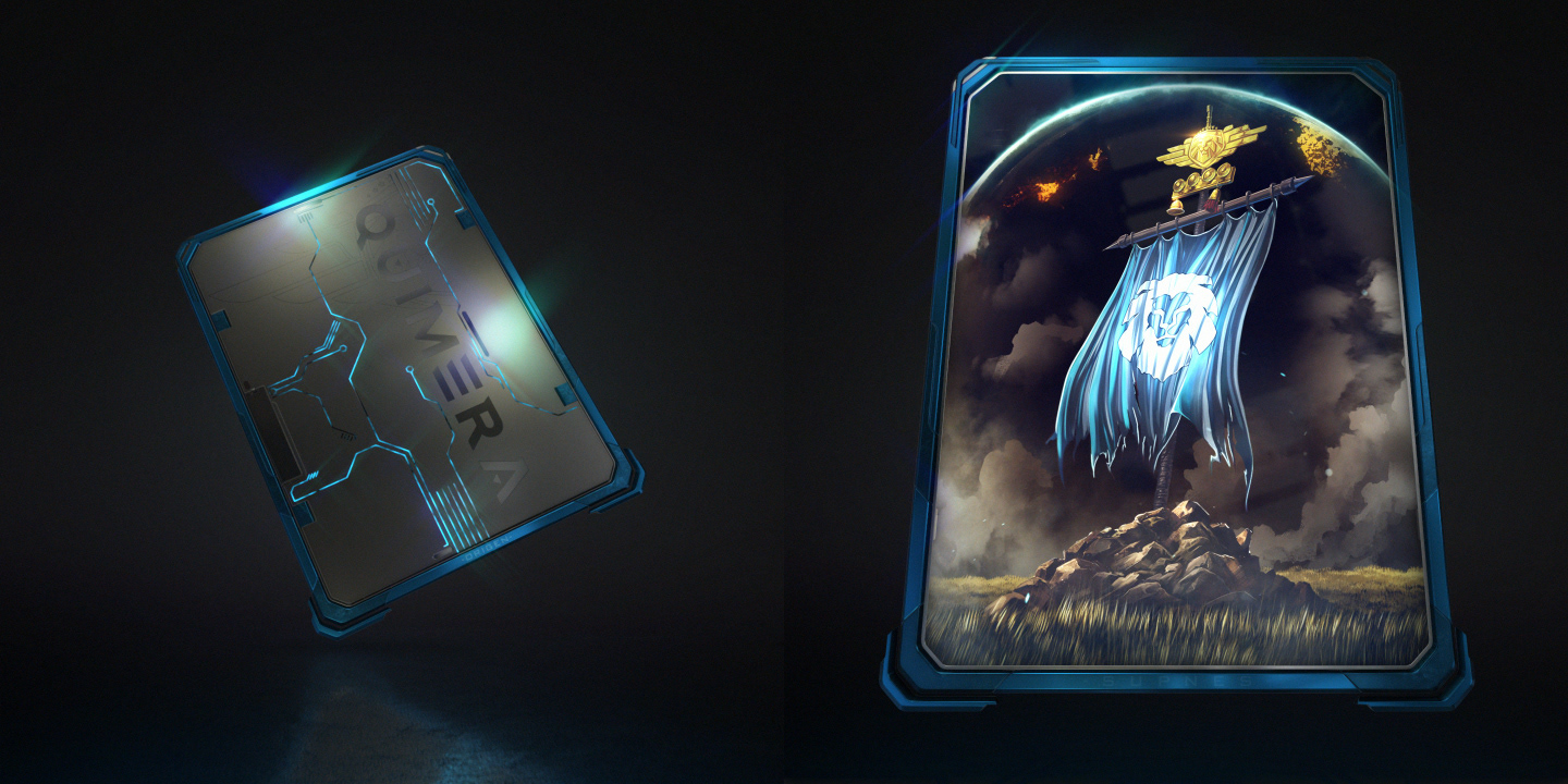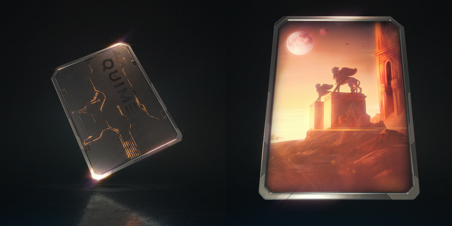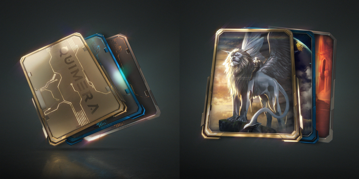 We did: Design, 3D modeling, and animation of a three-piece digital collectible card collection for Quimera. Each card features a tiered rarity system with distinct frame designs — gold, blue, and silver — paired with original fantasy illustrations on the front and circuit-patterned tech backs. Every card was fully animated.